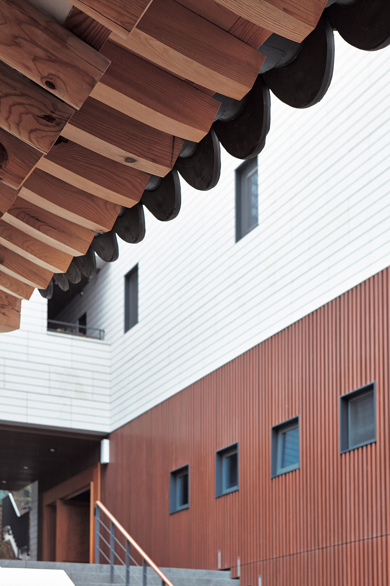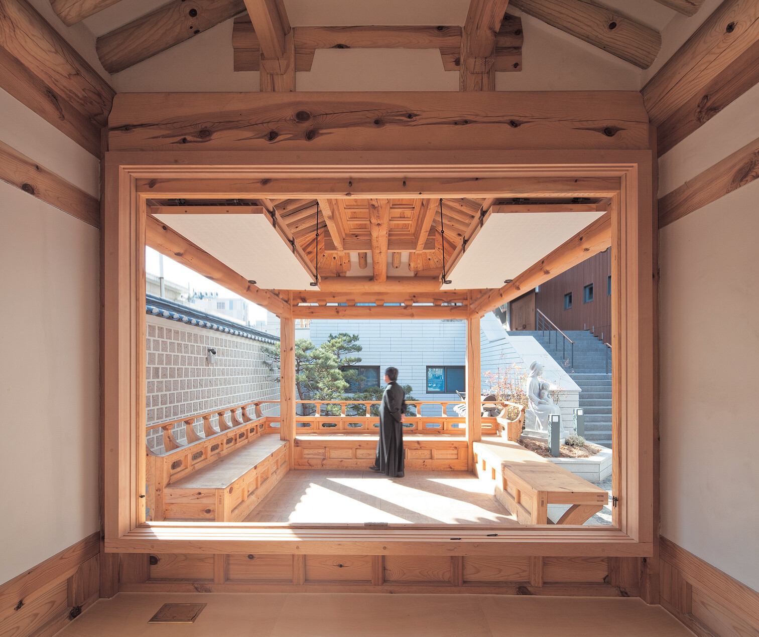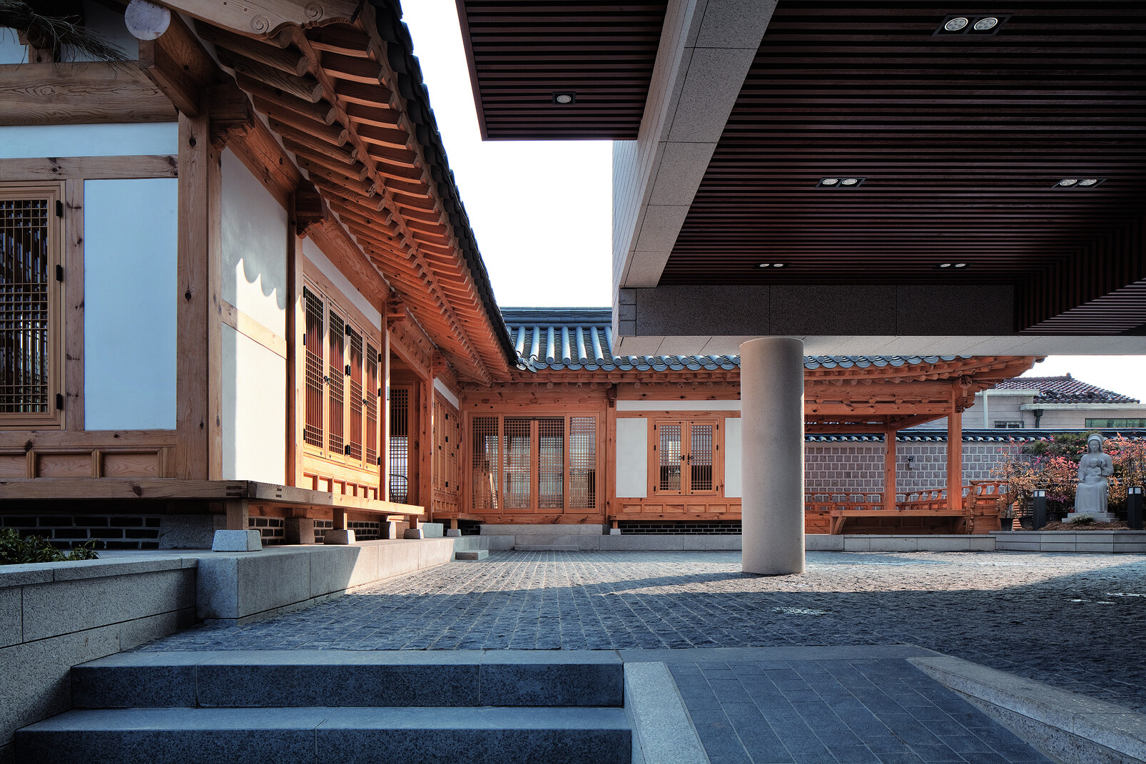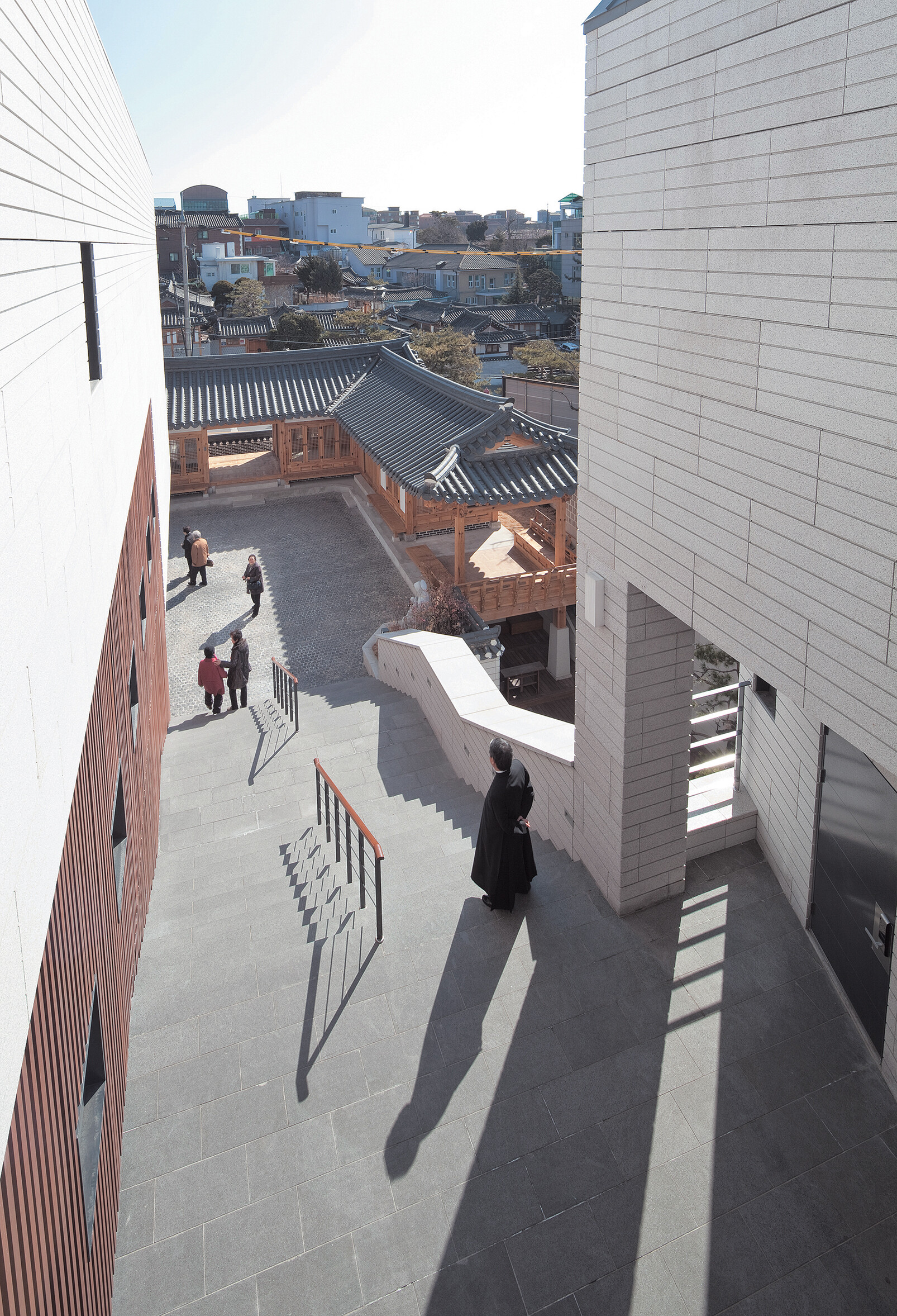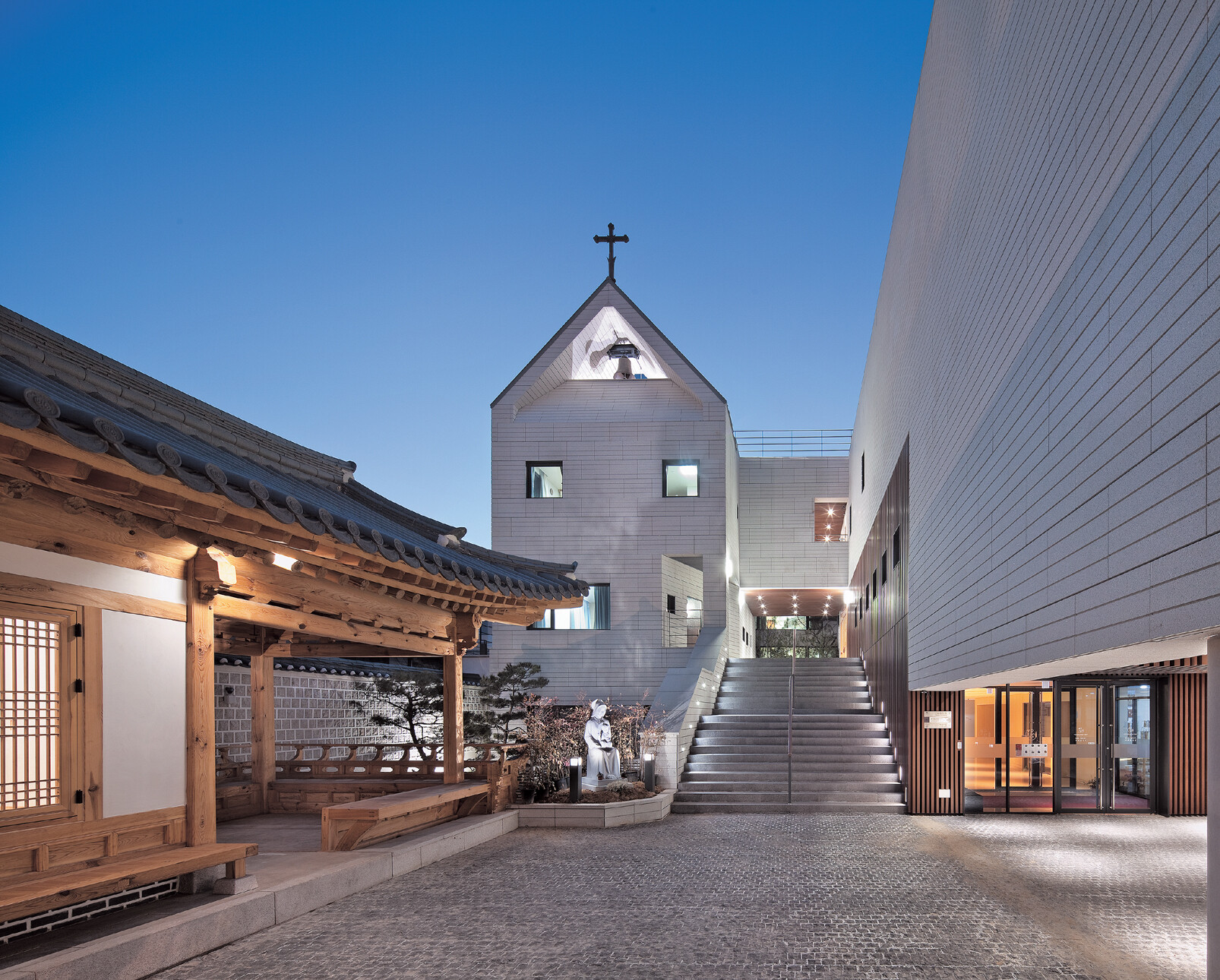 건축 의도처럼 어깨를 나란히 하는 것은 좋으나 자칫 지상 3층 규모의 본당 성전에 비해 단층 한옥이 초라해 보이지 않을까 하는 걱정이 앞섰다. 설계를 맡은 오퍼스는 독립적인 공간을 마련하고 이 공간을 터 전면에 내세우는 것으로 조율했다. 또 한옥과 근거리에 있는 화강암 외벽은 목재로 감싸 한옥에 미치는 영향을 최소화했다.