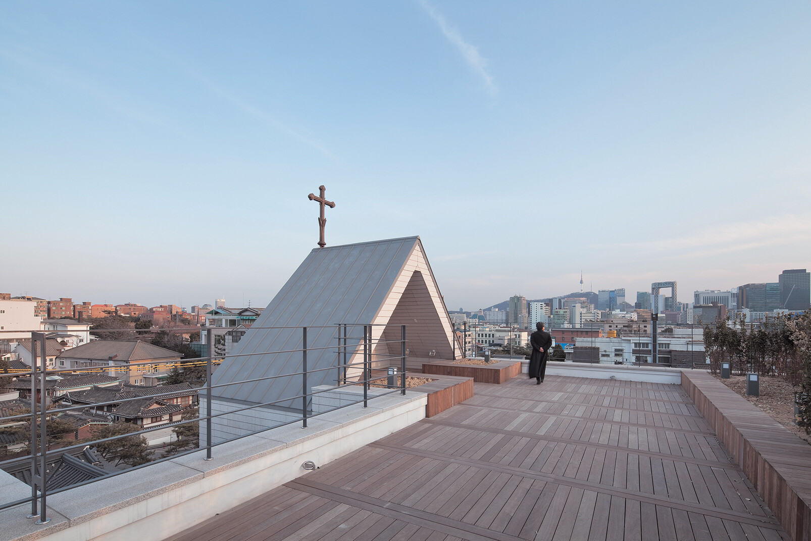 가회동성당은 옥상 역시 관리의 어려움에도 불구하고 시민들에게 개방하자는 쪽이다. 중앙에는 종탑이 자리한다. 신축 전에 있던 낡은 종탑에서 건져온 물건이다. 연도를 따지니 1958년, 독일에서 들여온 것이다. 송 신부는 구 건물을 허물기전 역사적 의미를 간직한 물건들을 손수 챙겼다. 옛 성당 건물에 있던 십자가도 사제관 꼭대기에 다시 세우고 정문 표지석도 지하마당에 놓았다. 제작 연도가 불분명한 제례용 의자도 솜씨 좋은 목수의 힘을 빌어 오병이어 문양을 새긴 후 전시관에 놓았다.