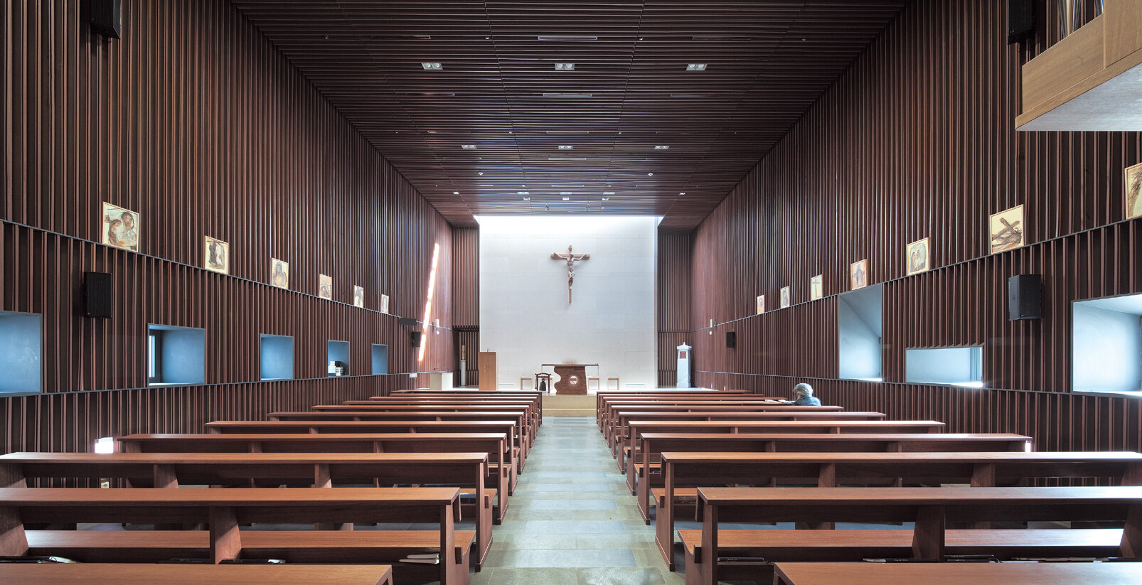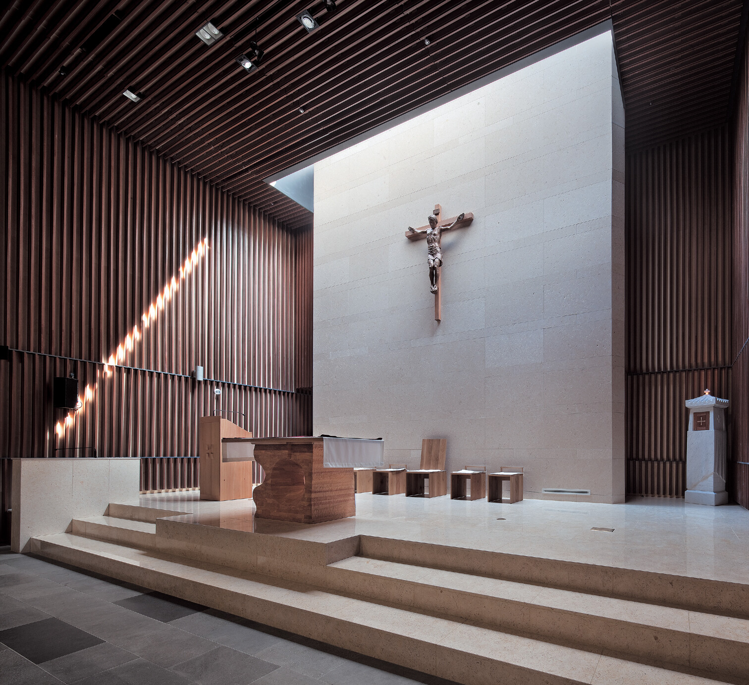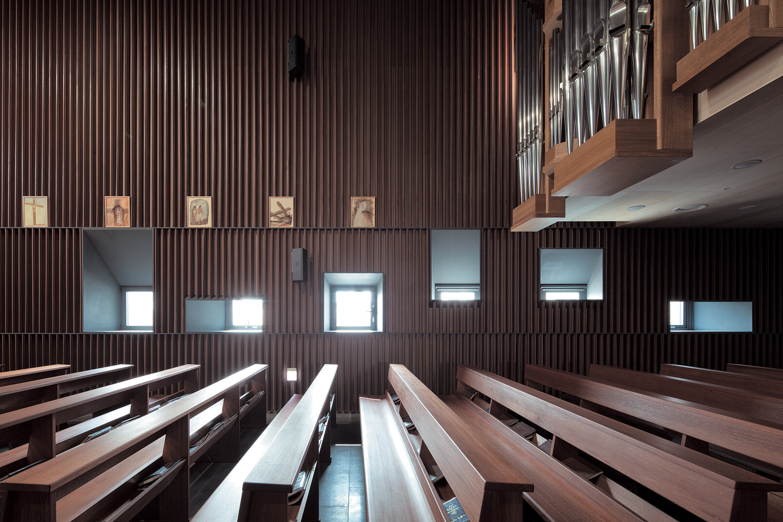이곳의 비대칭형 창 형태도 주목할 만한 아이디어다. 창으로 뚫린 벽을 다양한 마름모꼴로 변형한 결과 성전 내부는 기하학적인 빛 형상이 머물다 사라진다.