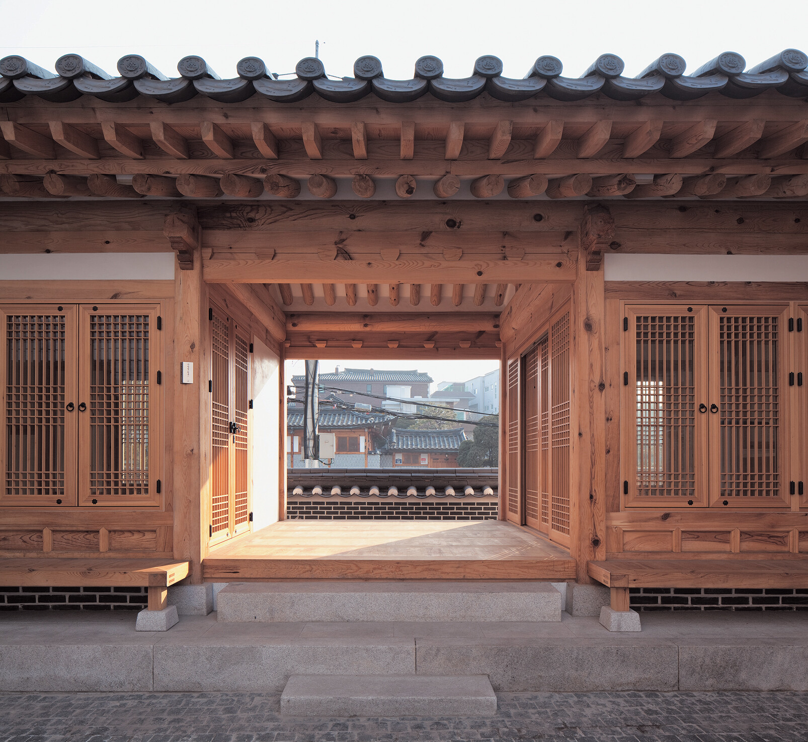 현장에서 기울인 노력은 압박을 깨고 구조체를 옮기는 난공사로 이어졌다. 그러나 목재만은 가공을 최대한 자제했다. 휘었으면 그 형상 그대로 서까래를 올렸다. 장인이 손길이 필요한 곳은 따로 있었다. 귀면와에 오병이어 문양을 새기는 세심함도 필요했다. 한옥 서편에는 쉼터로 쓰이는 정자가 자리한다. 이곳 정자 난간마다 꽃받침이 새겨졌다. 말하자면 그곳에 머무는 사람이 꽃이 되는 은유적 공간을 만들어낸 것이다. 대청 분합문을 열어서 들어 올리면 안채와 정자는 한 공간이 된다. 정자에 머문 이도 내부의 사정을 살필 수있다. 안채에 들었든 바깥에 머물든 전유 공간은 그 채에 머물지 않고 안팎으로 확장되는 구조다. 한옥은 북촌을 오가는 사람들의 사랑방 구실을 하고 있다. 창호는 난방을 고려해 이건산업에서 근래에 선보인 한옥용 문을 사용했으나 들어 올리는 문짝만은 노련한 목수의 힘을 빌려야 했다.